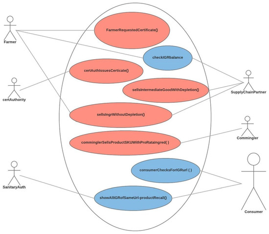 Bechini [25] builds on the CERERE project to introduce a data model for traceability and a set of patterns to encode generic traceability semantics and a suitable technological standards to define, register, and enable business collaborations. The Unified Modeling Language (UML) activity diagram shown in Figure 1 includes the responsible actors and the transitions involved in a traceable ingredient processing system.