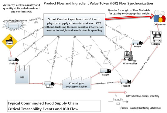 The use of smart contracts and blockchain tokens to implement a consumer trustworthy ingredient certification scheme for commingled foods, i.e., recipe based, food products is described. The proposed framework allows ingredients that carry any desired property (including social or environmental customer perceived value) to be certified by any certification authority, at the moment of harvest or extraction, using the IGR Ethereum token. The mechanism involves the transfer of tokens containing the internet url published at the authority’s web site from the farmer all along the supply chain to the final consumer at each transfer of custody of the ingredient using the Cricital Tracking Event/Key Data Elements (CTE/KDE) philosophy of the Institute of Food Technologists (IFT). This allows the end consumer to easily inspect and be assured of the origin of the ingredient by means of a mobile application. A successful code implementation of the framework was deployed, tested and is running as a beta version on the Ethereum live blockchain as the IGR token. The main contribution of the framework is the possibility to ensure the true origin of any instance or lot of ingredient within a recipe to the customer, without harming the food processor legitimate right to protect its recipes and suppliers.
