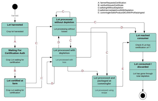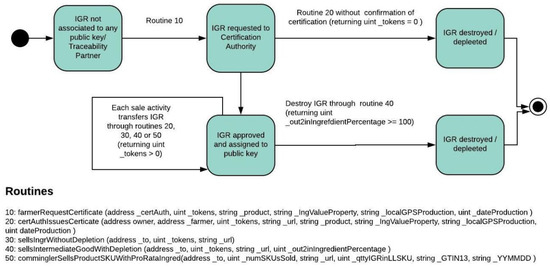 Finally, for the consumer to confirm that the specific lot of food includes certified ingredients, the consumer only needs to read the SKU GTIN 13 and validity date of the product to access the blockchain. This will lead him to all the harvest data at the certification authority web page URL. The different states for the IGR token are pictured in the IGR token state transition diagram Figure 7. Food lots event transitions are followed by the IGR transitions every time change of ownership or custody takes place.