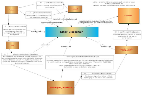 The implementation of the smart contracts followed the data flow diagram shown in Figure 8 which shows a generic case of ingredient provenance data being synchronized along its change of custody using the procedures of the IGR smart contract.