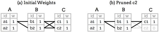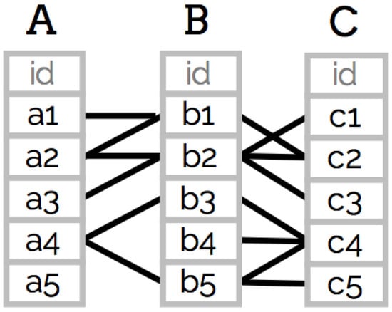 Wander Join represents the state of the art in online aggregation across JOINs, providing online aggregation support for computing summary statistics such as sums and counts. More importantly, it intelligently selects which records to join with by modeling the JOINs as a join graph and walking along edges to find valid joined data. Figure 1 shows an example join graph for joining tables A, B and C. Each row (e.g., a1, a2, …) represents a record in one of the tables, and an edge between two rows means that the two records can be joined in a natural join. Wander Join selects one record in table A, then randomly selects a path to table B, and repeats for table C. These edges are maintained by indexes on the tables. Indexes are a common database method to speed up access to each record, however these indexes need to be precomputed when data is loaded into the database.
