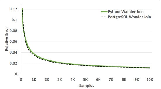 The relative error at 95% confidence level for our Python implementation of Wander Join and the original PostgreSQL implementation of Wander Join for 1 to 10,000 samples. Our reimplementation of the algorithm converges at the same rate as original Wander Join for a JOIN query with no filtering or GROUP BY in the query.