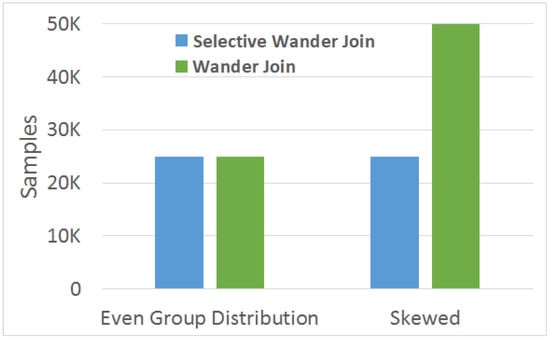 The number of samples needed for Wander Join and Selective Wander Join to achieve 0.05 relative error for all 40 groups in a GROUP BY query. Selective Wander Join and Wander Join require the same number of samples when the data is evenly distributed across all groups. However, Wander Join requires twice as many samples when 22% of data falls into 1 of the 40 groups. The more skewed the distribution is, the more samples Wander Join needs. Selective Wander Join samples evenly from all groups regardless of the distribution.
