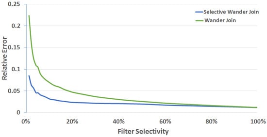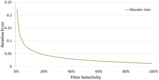Figure 4 shows the relative error for each level of filtering after 10,000 samples were taken for Wander Join. Note that when the selectivity is 10% (i.e., a “highly selective” filter because the WHERE clause in the query filters out 90% of the data), the uniform sampling approach of Wander Join can be inefficient. This is because most of the samples drawn by Wander Join in this highly selective query will be considered a “failed walk” as these samples do not satisfy the WHERE condition.