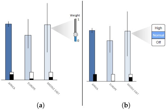 Demonstrating uncertainty encodings of relative error for bar charts using error bars and transparency. Weights for each group are encoded on the visualization with a black bar as a percentage from 0 to 100%. The higher the percentage, the heavier the weight (and therefore higher sampling rate).