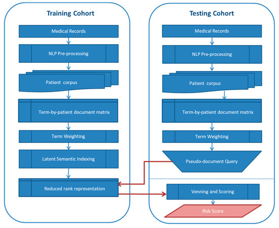 Semantic analysis and text-based risk prediction was performed using an algorithm developed by Quire Inc., which uses a vector space modeling approach called latent semantic indexing [27]. Here, patients were represented as a vector of weighted terms extracted from their medical records (Figure 2). A log-entropy term weighting scheme was used as described by Berry and Browne [27]. Once the term-by-patient document matrix was constructed, singular value decomposition (SVD) was performed to reduce the dimensionality of this matrix into lower rank approximation (concept space). We used a rank of 500 in this study based on evaluation of this and other collections. Patient similarities were calculated using the cosine of the vector angles [27].