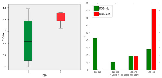 (Left) Text-based risk scores for training cohort for D30: 0 (No, Green) and 1 (Yes, Red). (Right) Observed D30 (percentage) for four different levels of text-based risk scores.