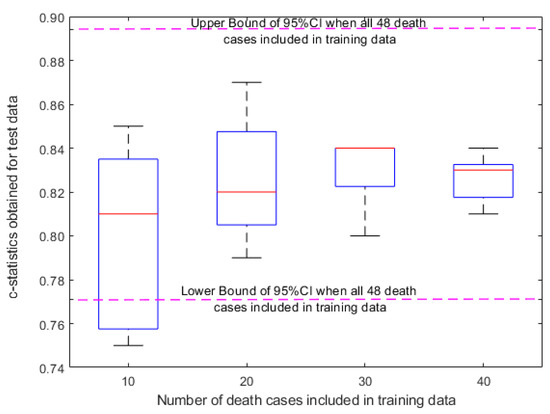We used the C-statistic to evaluate the performance of QPM on predicting postsurgical mortality risk. We found that using a sentinel pool of 48 (all D30 cases) in the training dataset, QPM achieved a C-statistic of 0.83 (95% confidence interval (CI) 0.77–0.89) on the independent test dataset. To evaluate the sensitivity of QPM with respect to the number of sentinels in the training dataset, we calculated the C-statistic using randomly selected smaller sets of sentinels. The average C-statistic for five randomly selected sets of 10, 20, 30, and 40 D30 sentinels were 0.80, 0.83, 0.83, 0.83 in the testing cohort, respectively (Figure 4). Although the C-statistics for all sets were similar, the variance of the C-statistic between the five random sets was larger with fewer sentinels. These results suggest that as few as 20 sentinel D30 patients in the training cohort could be effectively used to calculate the mortality risk in the test cohort.