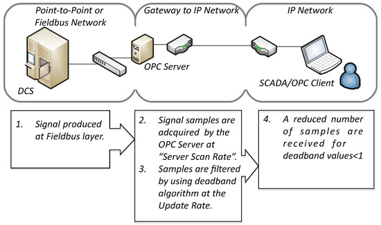 In order to explain how the OPC deadband algorithm reports the data from the fieldbus (left side) to the networks (right side), as outlined in Figure 1, we consider a sampled signal at the OPC server, originating from a field device connected to the OPC server using a dedicated hardware and software library. The first step in Figure 1 is the generation of the signal at the field device or a DCS (distributed control system). Then, samples of are acquired at the OPC server, which reports to the OPC client. The sensed samples are those that deviate from the values included in the most recent report, called the cache (). From the fieldbus side, we assume the physical sampling rate of , is established and pre-configured by the field technology vendor. This sampling rate is represented by the parameter in the OPC server and determined by using the field device vendor library [17,18]. From the SCADA/OPC client side, the reported changes of are received at an update rate negotiated by the OPC server and client—the OPC client requests the subscription to changes by the parameter and the OPC server responds by the , either by accepting the proposed rate or, if it is too high, by downgrading the rate to the . In most cases, the is a physically bounded value in the field device and is also specified inside the OPC server device driver.