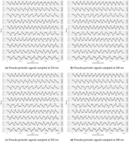 Pseudo-periodic signals sampled at (a) 210, (b) 240, (c) 252, (d) 300 milliseconds.