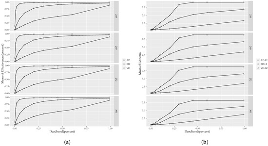 In all evaluated simulations in this paper, the adopted values of the d parameter were 0.001, 0.01, 0.02, 0.05, 0.10, 0.20, 0.30, 0.45, 0.60, and 0.99. In order to consider all d values, the functions deadbandAD, deadbandBD, and deadbandVD were repeated in a simulation loop in an R script.