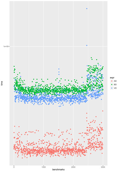 Since the application domain of these algorithms is mainly in embedded systems, a comparison of the CPU time usage was evaluated using the microbenchmarks package [42]. Figure 4 shows the mean of the overall CPU time used to compute all , with , for each of the algorithms: AD, BD, and VD. The CPU time measurement test was repeated 1000 times for each algorithm and thus we have 3000 benchmarks on the x-axis. The log scale in y expands the visual difference between the computation time of the BD and VD approaches. These two algorithms, as expected due to the presence of the moving average, require more CPU time than the AD algorithm. The increase in the mean CPU time from the AD to the BD algorithm was about 79%, while the increase from the AD to the VD algorithm was about 66%.