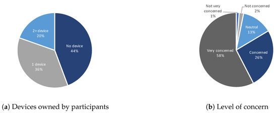 To assess whether respondents ranked security and privacy highly in theory, but not in practice, respondents were asked how concerned they would be if a smart device they owned was infected with a virus, but was still functioning as expected. Figure 2b shows that over three quarters of respondents 91 (58%) and 41 (26%) respectively said they would be very concerned or concerned.