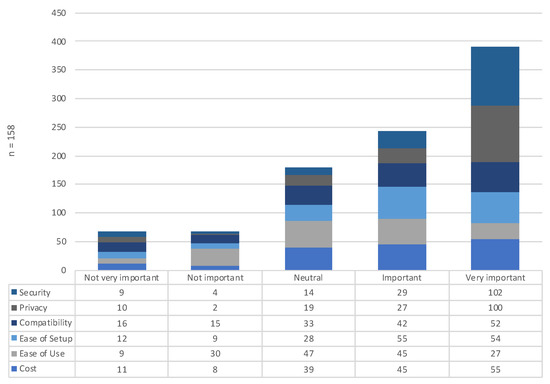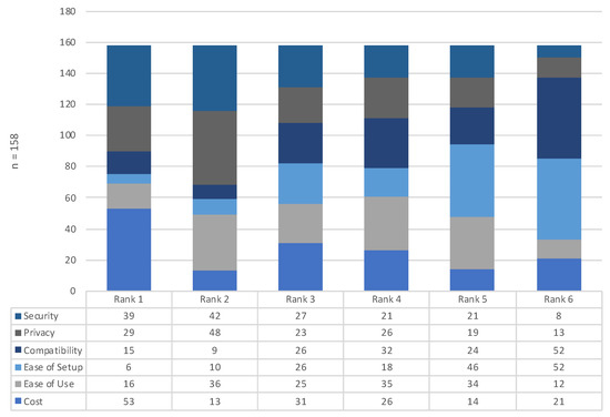 The first contribution of this paper is a study of attitudes towards security and privacy in the IoT. To assess whether respondents ranked security and privacy highly in theory, but not in practice, respondents were asked how concerned they would be if a smart device they owned was infected with a virus, but was still functioning as expected. In asking this question, the aim was to assess whether the well documented phenomenon known as the Privacy Paradox, was evident in the context of attitudes towards IoT devices. The privacy paradox has been well documented in papers such as [28,29], and although mainly in the context of online security, demonstrates that user attitudes towards security and privacy, often differ from the actions they take or decisions they make. Indeed, this has been highlighted in studies such as [10,13] discussed in Section 2. In our study, Figure 2b shows that given a scenario where a device was infected with malware, but still functioning normally, over three quarters of respondents indicated that they would still be very concerned. When asked to rate the importance of various features related to IoT devices (as shown in Figure 3), security 102 (65%) and privacy 100 (63%) were clearly considered very important features. However, interestingly when asked to rank the features in order of priority, cost was ranked higher than both security and privacy by the largest percentage of respondents 53 (34%) (see Figure 4). In [30] it is suggested, while many users show theoretical interest in their privacy and maintain a positive attitude towards privacy-protection behavior, this rarely translates into actual protective behavior. Our results could confirm this, and suggest a possible dichotomy between privacy attitudes and actual behavior, in terms of procurement of IoT devices.