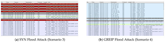 In scenarios 3 and 4 users were presented with recorded outputs from a popular packet capture tool (wireshark) as shown in Figure 6. The use of the packet capture tool significantly improved detection in scenario 3 with 120 (76%) of respondents now indicating they knew when an attack took place. Results in Table 4 confirm this, with 76 (48%) [11–20 s] and 92 (58%) [21–30 s] correctly identifying the time period when the attack took place. However, in scenario 4 the packet capture tool did not appear to improve detection, as results presented in Table 5 show respondent responses were varied across all time periods. The number of respondents who indicated they knew when the attack took place also dropped to 93 (59%).