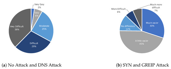 Results for the four scenarios are presented in Table 2, Table 3, Table 4 and Table 5 with time periods highlighted bold indicating when the associated attack took place. In scenario 1 97 (61%) of respondents indicated they could not tell if the IoT IP camera was infected and an attack took place (see Table 2). Respondent responses were consistent across all time periods. In scenario 2 an attack took place during time period [31–50 s]. Again, most respondents 94 (59%) indicated they could not tell if the IoT IP camera was infected and an attack took place. Respondent responses were again consistent across all time periods. When asked how easy it was to identify when the IoT IP camera was infected, 32 (38%) indicated very difficult, 25 (29%) difficult (see Figure 7a), indicating that it was not easy to detect if the device was infected from the presented live video feed shown in Figure 5. This was consistent with our own observations that during the infection process and attacks, the camera did not display any adverse symptoms of infection, and continued to function as expected. Remote access to the device was still possible, and performance did not appear to be degraded. Live video streaming continued to be as responsiveness as prior to the attacks. Therefore, without any clear signs of an infection it was confirmed that detection or awareness or botnet activity proved very difficult within consumer networks.