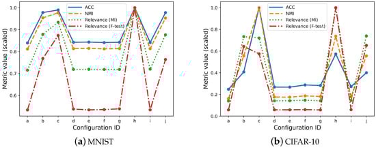 Due to the fact that mutual information involves the conditional probability of one variable given the other, frequently, the exact computation of mutual information is intractable. To overcome the intractability of mutual information, we use tractable estimations. In our experiments of estimating the mutual information between latent features and ground truth labels, we use the Nearest Neighbour method as referenced in Reference [41], with hyperparameter . We used the Scikit-learn [42] implementation of the Nearest Neighbour mutual information estimation that involves some stochasticity. For that reason, we report an average value of 50 seeded runs. In some cases, F-test values were used instead of mutual information [43]. We report both variations of relevance (mutual information and F-test values); additionally, for comparison purposes, we report the metrics used in order to evaluate the effectiveness of the evidence transfer for clustering (unsupervised clustering accuracy and normalised mutual information, noted as ACC and NMI respectively).