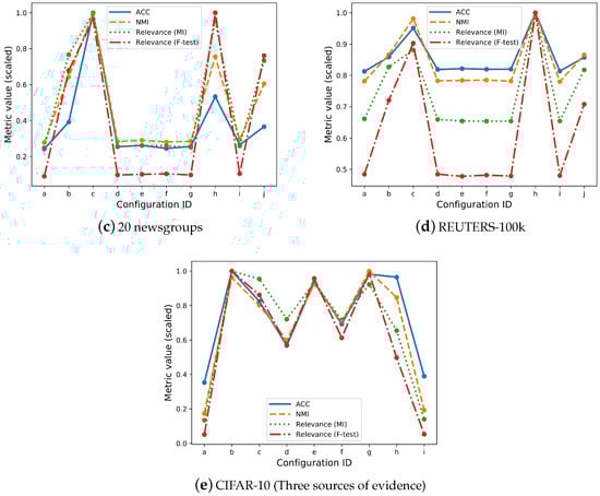 A comparison of the Relevance metric from feature selection with Unsupervised Accuracy (ACC) and Normalised Mutual Information used for clustering prediction evaluation: We compare both approaches of Relevance (Mutual Information and F-test). To interpret the effects of evidence transfer, we analyse the behaviour of these metrics in five different scenarios. Each subfigure represents a single scenario, and the comparison of the metrics is performed individually on each scenario. For visualisation purposes, we normalise all four metrics using the max norm. We observe similar trends in the behaviour of all these metrics for all predefined experiments and configurations. In subfigure (e), we plot the results of configurations involving three sources of evidence and, hence, the differences in shape compared to the other subfigures.