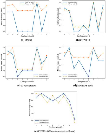 To study the effects of evidence transfer from the perspective of individual latent feature, we compute the variations in feature ranking during both phases of evidence transfer. First, using the initialised latent space from the baseline solution, we create a ranking of the latent features according to the relevance metric (mutual information estimation). Then, we create several rankings, one for each configuration solution (according to our experiments), again by using relevance as ranking criterion. We proceed by measuring the changes in the rankings before and after the deployment of evidence transfer. We calculate the amount of features that shifted ranks, and then, we divide this amount with the overall amount of latent features; for normalisation purposes, we note this metric as “Rank Variation”.