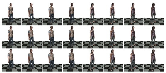 We decided to assign gender to a self-avatar as the one specified by the participants when filling in the demographic questionnaire form. Since we wanted to provide an embodied experience and make the participants feel that the body that represents them is their own, we decided to allow participants to choose a self-avatar that most closely represented their skin color and dimensions. To do this, we designed twelve male and twelve female avatars with variations in skin color (light, medium, brown, and black), and size (skinny, regular, and fat). We developed a simple interactive application in Unity3D that showcases these avatars. All 24 avatars were designed in Adobe Fuse, and a simple idle motion was assigned to them. Each participant was able to zoom in and out and rotate the avatar in order to observe it from different perspectives. Participants were able to choose the avatar that best represented them, and the selected one was later used as the self-avatar. Figure 1 shows all 24 avatars that were used in this study.