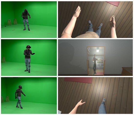 - Gonzalez-Franco, M.; Perez-Marcos, D.; Spanlang, B.; Slater, M. The contribution of real-time mirror reflections of motor actions on virtual body ownership in an immersive virtual environment. In Proceedings of the 2010 IEEE Virtual Reality Conference (VR), Waltham, MA, USA, 20–24 March 2010; pp. 111–114. [Google Scholar]