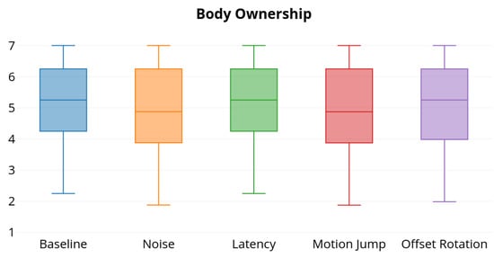We start by presenting the results on participants’ sense of body ownership. Body ownership measures were based on questions Q1–Q4, which were asked only once for each motion artifact. By analyzing the four-item scale, we found that there was no significant impact of the motion artifacts on body ownership for all examined conditions (baseline motion capture, noise, latency, motion jump, and offset rotation of joints) of the experiment [, , , ]. This was an expected result since it is common for participants to perceive a virtual body as their own even if it does not match their appearance exactly [39,49]. The obtained results concerning body ownership are presented in Figure 4.