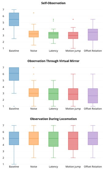 Another observation we would like to discuss based on the obtained results is related to the way that participants ranked the four developed motion artifacts on the sense of self-agency. By looking at the mean values of the obtained results, the baseline motion received the highest scores. Regarding the four motion artifacts that were developed for this study the following results were obtained. For the self-observation task, the noise received the second highest score, followed by the offset rotation, the latency, and the motion jump artifacts. For the observation through mirror task, the noise received the second highest score, followed by the latency, the motion jumps, and the offset rotation artifacts. Finally, for the observation during locomotion task, the offset rotation received the second highest score, followed by the latency, the noise, and the motion jumps. Based on this observation, it can be said that there is no specific pattern in the way that each motion artifact affected the sense of self-agency for the three examined observation tasks. Therefore, it can be further said that the way that participants observe their motion altered the way that they rated their sense of self-agency for each of the motion artifacts. Lastly, it can be finally said that in the self-observation and the observation during locomotion task, the motion jump was the one that most affected the sense of self-agency and for the self-observation and observation through mirror task, the noise was the one that least impacted the sense of self-agency.