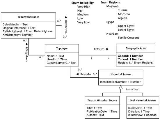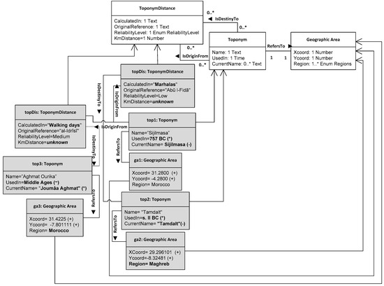 This section describes the application of the solution proposed in previous sections to a real scenario in Digital Humanities. This scenario occurred with a research project carried out at the Institute for Medieval and Renaissance Studies and Digital Humanities (Instituto de Estudios Medievales y Renacentistas y de Humanidades Digitales IEMYRhd) [42], University of Salamanca, Spain. The research project, named DICTOMAGRED [43], analyses historical sources (including oral testimonies, legal documents, literature, etc.), most of them in Arabic, which contain geographical references describing routes through different areas in the Maghreb, their place names, their topography, and other related issues. The main goal of the project is “to provide a software tool for humanities specialists to retrieve information about the location of toponyms in North Africa as they appear in historical sources of medieval and modern times” [43]. Due to the heterogeneous nature of these historical sources, both in type and chronology, multiple needs appeared in relation to the representation of vagueness. In addition, and as in most cases in digital humanities research, vagueness not only helps researchers to better represent the area of study, it also provides additional knowledge about it. For this project in particular, needs included the specification of the degree of certainty of sources in relation to place names, the description of population estimates of the different geographical areas, and the indication of whether these places are now inhabited or not, among others [44]. Figure 1 shows an excerpt of the class model created for the project, focusing on toponyms (i.e., place names) and relations between them, the related geographical areas, and the historical sources that were employed.