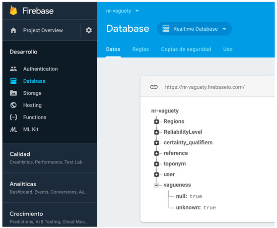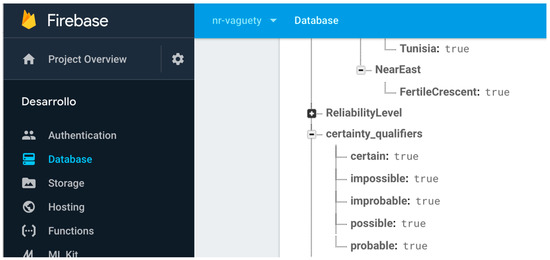 Figure 4. Firebase console showing the data node for defining certainty qualifiers in DICTOMAGRED implementation. - Abstract enumerated items. Some systems use numeric values for representing levels of abstraction in a hierarchical structure of items. Other values are sometimes used as ad hoc formatted values for these semantics, as chains of strings separated by special characters like “.” or “/” for representing the entire path of the enumerated item value (Region = Magreb.Morocco). However, these practices often introduce ambiguity and confusion in the information, as they may constitute acceptable values for the associated attributes or responds to arbitrary implementation decisions. It is also common practice to create implement abstract enumerated items as in the previous certainty qualifiers mechanism, defining a hierarchical node in the non-relational structure and putting the most concrete value of the hierarchy (Region = Morocco). Then, the software system iterates this node in order to obtain at what level of abstraction the value is described. The final possibility is to define the hierarchical node but putting as Boolean values of the attribute all the levels involved (Magreb = true; Morocco = true). Both last solutions follow a non-relational structure and are operational for implementing abstract enumerated items. However, iterating the node each time we want to solve the abstraction information is inefficient in non-relational environments, so finally we chose the Boolean values structure. Figure 5 shows the non-relational node defined for the regions enumerated type and their items, and their use in a specific toponym information description in DICTOMAGRED.