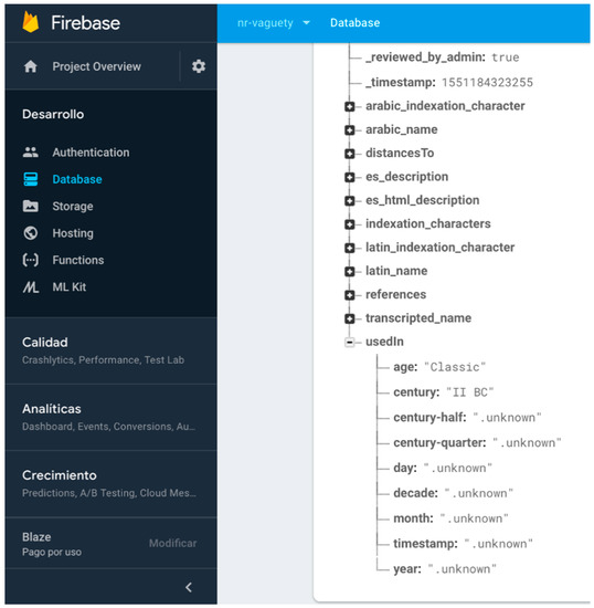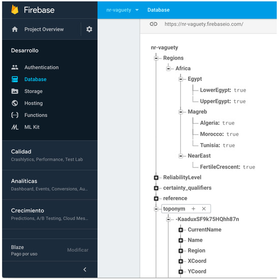 Figure 5. Firebase console showing the regions data node implementing the abstract enumerated items mechanism. - Arbitrary time resolution. Most of the non-relational systems use the timestamp mechanism to represent temporal values (number of milliseconds after 1st January 1970). The need for representing previous dates at any granularity level in digital humanities makes timestamps use impossible for humanities information. There are some non-relational systems, such as MongoDB [48], that present specific data types for dates but with a very rigid format guided by ISO 8601 standards, which also presents other problems for humanities information, such as absence of support of Julian calendar or problems in data conversions between other date systems, such as Hegira (used in DICTOMAGRED project), Chinese calendar, etc. These limitations encouraged us to implement class library supporting the arbitrary resolution inherent to the time data type in ConML, which allows for some of the most usual forms of time representation, including simple and incomplete dates (and times), years, decades, and centuries. Now, we have implemented part of the functionalities of the class library in the non-relational environment for DICTOMAGRED. Similar to the certainty qualifiers implementation, we have defined a node in the non-relational structure with a hierarchical conceptualization of vagueness points in a timeline that we want to manage (years, decades, centuries, time eras, etc.). Then, we included a key-value structure referring to the specific point in time used for solved a given value. For instance, UsedIn = middle ages contains a key-value structure indicating that the value “middle ages” needs to be interpreted as the “Age” level of granularity in time. Figure 6 shows the non-relational node defined for the arbitrary time resolution, and its use in a specific toponym information description in DICTOMAGRED.