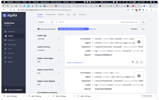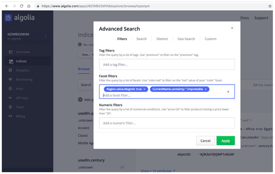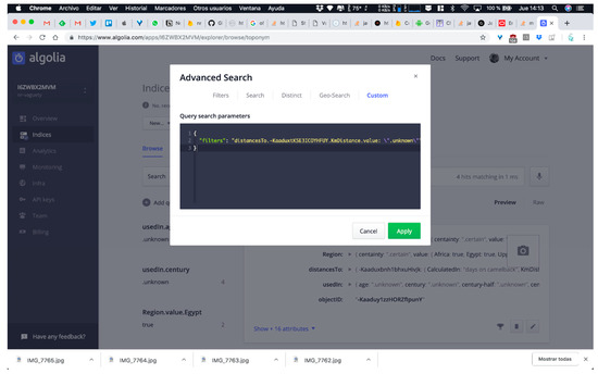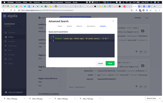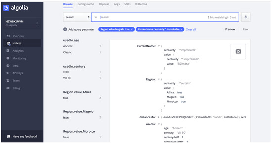Note that all queries require, at least, the use of one vagueness mechanism or even combined versions of them, in order to offer to the DICTOMAGRED users (mainly researchers on Arabic language; Magreb topography, history, and/or archaeological remains; etc.) responses to their research questions (Figure 8, Figure 9, Figure 10, Figure 11, Figure 12 and Figure 13). Next Figure 8, Figure 10, and Figure 12 show how these queries are executed, and Figure 9, Figure 11, and Figure 13 show the corresponding results consulting our Firebase non-relational database using the Algoria search engine. Note that, for executing a query in the Algolia dashboard, it is necessary to define as filters or facets [51] the parameters that the query requires, in our case region as Maghreb and CurrentName certainty as improbable in the query A (Figure 8), KmDistance as unknown in the query B (Figure 10) and UsedIn as middle ages or second century B.C. in query C (Figure 12).
