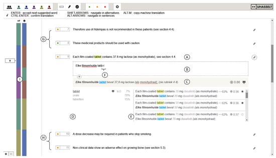 An overview of the SCATE interface. Ⓐ The sentence to translate, Ⓑ the editing field, Ⓒ the hybrid MT that also includes pretranslations, Ⓓ a list of translation alternatives coming from the term base, TM and MT, Ⓔ fuzzy matches, Ⓕ suggestion from autocomplete, Ⓖ previous source sentences, Ⓗ upcoming source sentences and Ⓘ a progress bar.