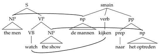 An example node-aligned parallel tree (Gloss of the Dutch sentence is “the men look at the show”).