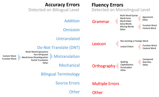 Certain similarities can be observed between some of the accuracy and fluency error categories in the error taxonomy, such as extra words versus addition, missing words versus omissions or orthography–capitalisation versus mechanical–capitalisation. As the main distinction between accuracy and fluency errors in the taxonomy is based on the type of information that is needed to be able to detect them, accuracy errors do not necessarily imply fluency errors, or vice versa, for that matter [35].
