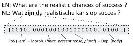 Binary vector for zijn (are) consisting of 1s for its PoS, morphology and dependency features and 0s for the remaining items in the vocabulary.