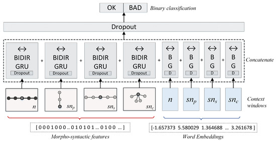 Besides surface context windows (n-grams), we utilised syntactic context windows for each given target word, which we extracted from the dependency parse tree for each given MT output. Syntactic n-grams enable us to capture long-distance dependencies in MT output, which can be considered as an important piece of information especially for detecting Fluency–Grammar errors. Combining morpho-syntactic features with surface and syntactic n-grams, we propose an RNN architecture, which is illustrated in Figure 7.