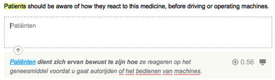 When starting the translation of a sentence, the default translation comes from hybrid machine translation. The complete translated sentence is presented immediately below the text box Ⓒ and can be copied using a single shortcut. The hybrid machine translation builds on the research on both machine translation and fuzzy matching, discussed in Section 2. As other results from fuzzy matching can help during translation, the top results are also presented to the translator in Ⓔ. At the right-hand side of both the hybrid machine translation Ⓒ and fuzzy matches Ⓔ quality estimations are presented. Research on quality estimation is described in Section 3. The relevant terms of these fuzzy matches are also presented in the list of alternative Ⓓ, just as results from an automatically extracted term list, for which frequency information in the source is also presented. Results on the topic of term extraction are discussed in Section 4. The integration of speech recognition in the translation process is described in Section 5.