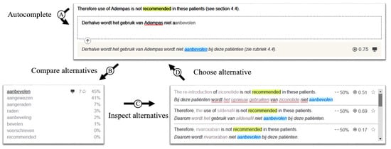 Figure 1 provides an overview of most parts of the project, through a prototype user interface (which is described in detail in Section 6) of the Smart Computer-Aided Translation Environment. A demo version of the prototype is available at http://scate.edm.uhasselt.be/). A professional translates a sentence under translation Ⓐ using a large text entry box centrally on the screen Ⓑ. The central placement provides space for context—Ⓖ preceding and Ⓗ subsequent sentences, overall translation progress (Ⓘ) and configuration options in the top bar. Autocomplete Ⓕ assists translators during their task. Suggestions come from multiple sources, all related to technologies developed or improved within the project. A translator can accept the default suggestion, choose an alternative term from the presented options Ⓓ or start typing a different translation.