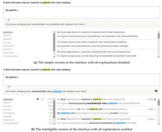 - Coppers, S.; Van den Bergh, J.; Luyten, K.; Coninx, K.; van der Lek-Ciudin, I.; Vanallemeersch, T.; Vandeghinste, V. Intellingo: An Intelligible Translation Environment. In Proceedings of the 2018 CHI Conference on Human Factors in Computing Systems, Montreal, QC, Canada, 21–26 April 2018; ACM: New York, NY, USA, 2018. CHI ’18. pp. 524:1–524:3. [Google Scholar] [CrossRef]