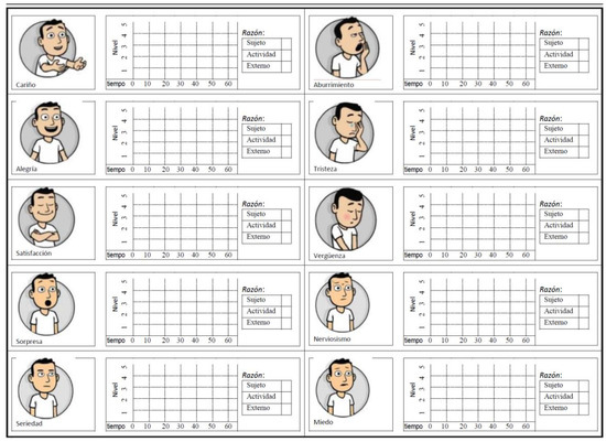 In this work, we selected a subjective emotional assessment instrument called EMODIANA [54]. This instrument portrays ten principal emotions: love, joy, satisfaction, surprise, nervousness, shame, sadness, and fear. The EMODIANA can measure not only the emotion, but also its intensity. In particular, we used an EMODIANA adapted for DS that allows the observer to register the different emotions of a student during a session (Figure 1) [52]. This instrument can be used directly during the session or to analyze recorded videos of a session [55]. After that, it is possible to classify the emotions into positive, negative, and neutral emotions.