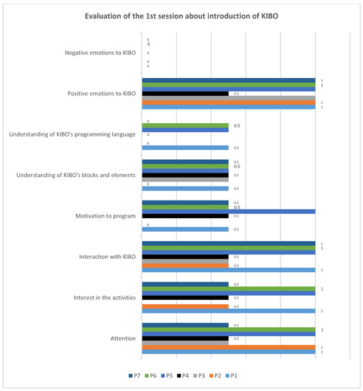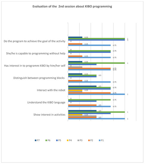 In this section, we present the main results of this pilot study and answer the research questions. Regarding the research question of this pilot study, “Do students with DS engage with the KIBO robot? (degree of motivation)”, the results showed a positive engagement impact. The interest in the activities was high (1) in 3 participants and medium in the other 3 (0.5). The programming motivation was medium (0,5) in 4 participants and high in one (1), and every participant interacted with KIBO satisfactorily. On the question “Can DS students code with KIBO? (degree of comprehension of the sequences and programming)”, we observed that except for two students, five understood KIBO’s blocks and elements and were able to program basic sequences to achieve the goals proposed in the activities. Four students were able to program KIBO without help. On the third research question, “How does KIBO affect the emotional behavior of students with DS? (observed interactions and emotions)”, we observed high positive emotions during the intervention with KIBO in six students (1), medium in one (0.5), and no negative emotions. Figure 6 and Figure 7 show the results of the behaviors observed during the two intervention sessions where the students worked on programming concepts.