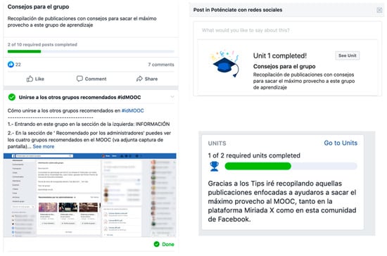 The “Units” tool of the group has been used, which allows the teacher to organize those publications that he considers appropriate within the units. In the case of the MOOC they were used as tips or pieces of advice, to get the most profit from each module. Four units or tips were created, within which the teacher organized all the publications of the team, to avoid that these were lost in the time line of the group between so much publication of the participants. The units allow to make them obligatory, in such a way that they appear to the student as incomplete in a progress bar that as the reading seeing will be completed. Figure 1 shows on the left a unit, one can see the bar that indicates graphically and numerically the number of publications of the unit viewed and an example of publication, at the end the option can be seen “done” that the user can mark once viewed; to the right is the information message that appears to each user after finishing a unit and below the general bar that every user sees in the group, indicating the number of completed units.