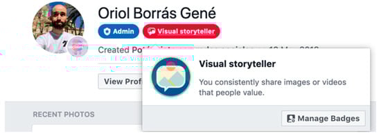 On the other hand, the use of a digital social network as a support to the VLC and from the point of view of the applied gamification, not only allows the use of a more social and collaborative dimension, it also offers its own elements (likes, units, shares, and badges) that could be adopted within the gamified design of the MOOC, which tend to be unnoticed in the literature. These kinds of elements encourage dynamics such as socialization, participation, debate, status or progress. Figure 2 shows an example of how badges associated with a profile would look (admin and visual storyteller).