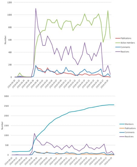 Figure 5 shows that there has been activity, once the edition of the MOOC is finished, both in publications and in interactions, therefore, it has been possible to create a habit and for the members to see the usefulness of participating in this type of communities. Gamification promotes socially desirable learning behaviors [], in this case the use of the social network itself as a learning space in which to share content.