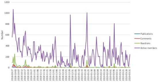 In order to check whether a compromise had really been achieved and to create a habit in the use of VLC, independently of MOOC, Facebook group was analyzed as soon as the edition of MOOC had been completed, without any kind of community dynamization or emails encouraging participation. Figure 5 shows the result of the activity between 26 September, 2018 and 1 April, 2019, the day before the start of the second edition of the MOOC. The result was an increase of 425 new members, 387 publications, 605 comments, and 2755 reactions. An average of 53.4 active members per day, albeit with a large deviation (196.4).