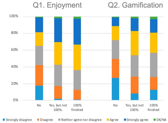 Firstly, the students’ perception of three aspects related to the MOOC was analyzed: enjoyment and gamification; directly related to questions 1 and 2 respectively. Figure 6 shows each of the three aspects related to question 7 on whether the MOOC was completed at 100%, 75%, or not.