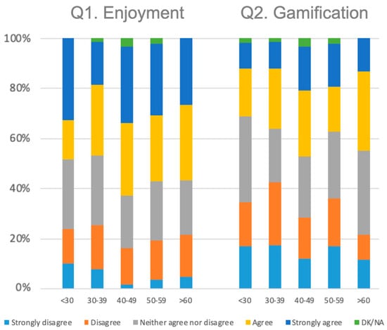 For fun, the values are around 45.3% of the 30–39 age group and 48.3% of those under 30; and the maximum values of 59.5% for the 40–49 age group and 56.7% again for those over 60. The other aspect, most related to gamification, only the age range between 40–49 with 43.9% and over 60 with 45% have felt in a game. As expected, those under 30 were the most skeptical with 29.3%.