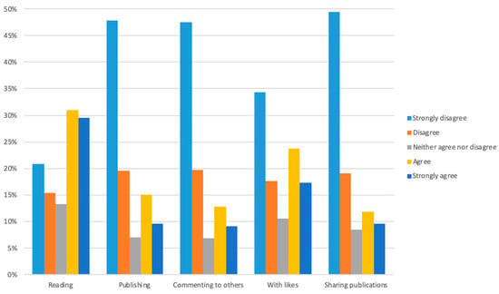 Figure 8 shows the answers given to the degree of participation in the Facebook group using its different elements.