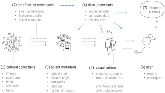 - Windhager, F.; Federico, P.; Schreder, G.; Glinka, K.; Dörk, M.; Miksch, S.; Mayr, E. Visualization of Cultural Heritage Collection Data: State of the Art and Future Challenges. IEEE Trans. Vis. Comput. Graph. 2019, 25, 2311–2330. [Google Scholar] [CrossRef] [PubMed]