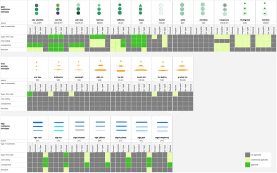 - Gschwandtner, T.; Bögl, M.; Federico, P.; Miksch, S. Visual Encodings of Temporal Uncertainty: A Comparative User Study. IEEE Trans. Vis. Comput. Graph. 2015, 22, 539–548. [Google Scholar] [CrossRef] [PubMed]